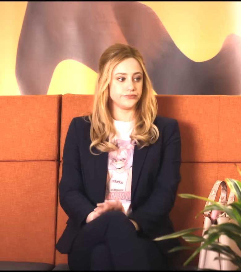 We have found a similar item on Etsy for you to style. Natalie wears her suit with a printed pink tee, which adds a feminine touch to her otherwise formal look.