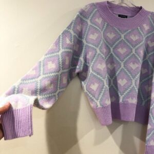 In the world where she starts a family and raises her daughter, you can spot Natalie donning a super cute Alpaca sweater. We love the subtle print with cute white hearts. We have spotted an interesting item online in beige color with a minimalist design.