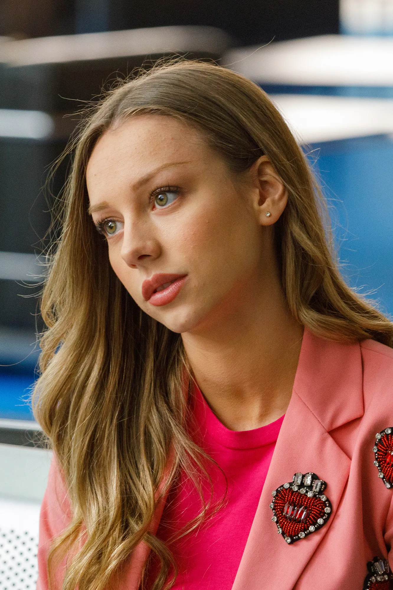 In a typical look away from the confines of her school uniform, Carla has paired different shades of one of her favored wardrobe colors, pink, to create her look. Starting with a lighter pink tailored blazer paired with a matching pink crop top and mini-skirt.