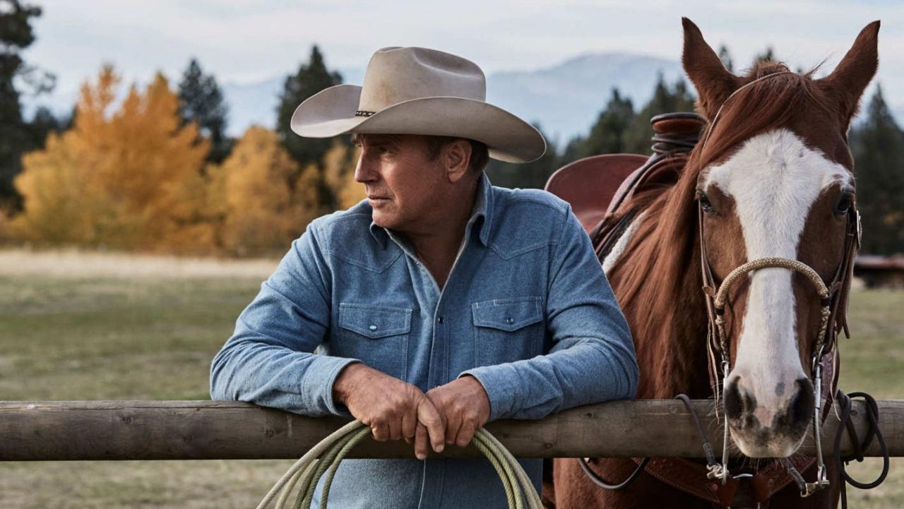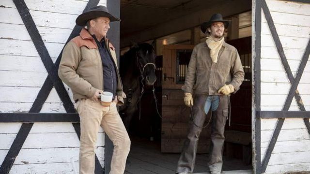 John Dutton, the main character of the series and the patriarch of the Dutton family, is dressed in khaki trousers, a rancher jacket, and a white ten-gallon hat.